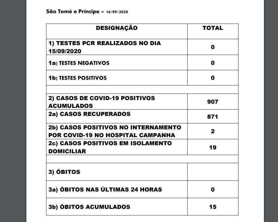 São-Tomé, 16 Set 2020 ( STP-Press ) – São Tomé e Príncipe não realizou, nas ultimas 24 horas, nenhum teste para detetar infeção por coronavírus e total mantem em 907 por acumulação, sobe-se esta tarde do ministério da Saúde.